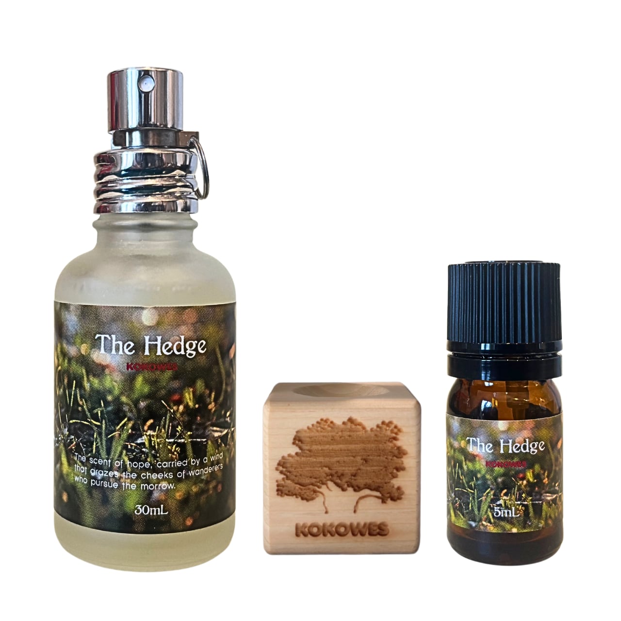 The Hedgeのブレンドスプレー、ブレンドオイル、HOME THREE(アロマディッシュ)の3点セット商品です。香りの詳しい説明は、スプレーもしくはブレンドオイルの商品ページをご確認ください。